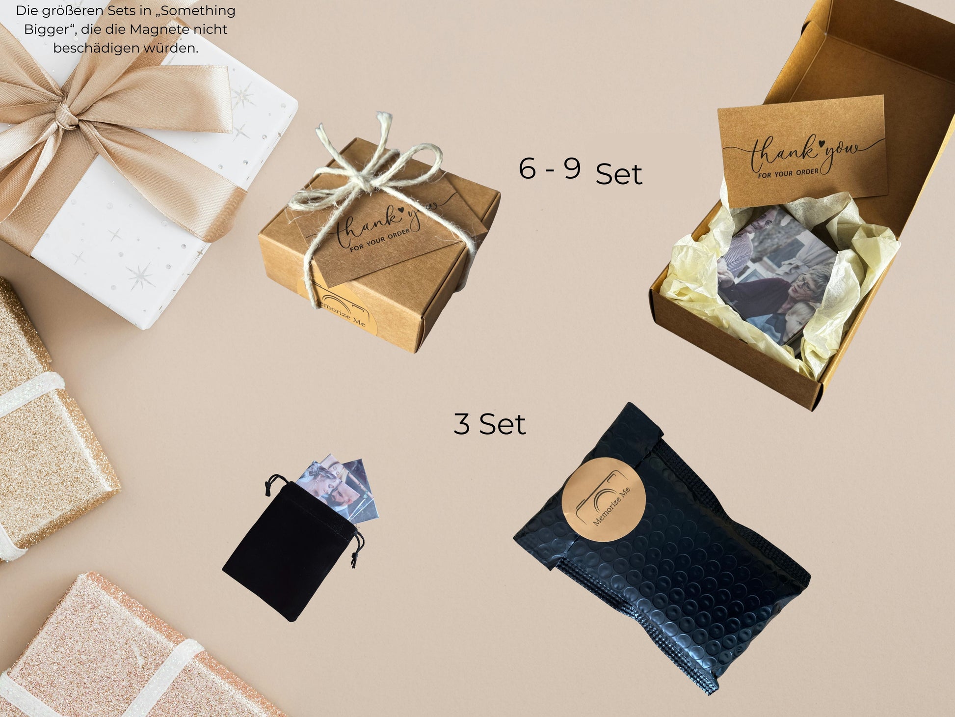 Abgebildetes Verpackungsbeispiel gilt für Sets bis zu 9 Fotomagneten. Größere Bestellungen (z. B. 20, 30 oder 100 Stück) werden sorgfältig in einer passenden, sicheren Verpackung versendet.